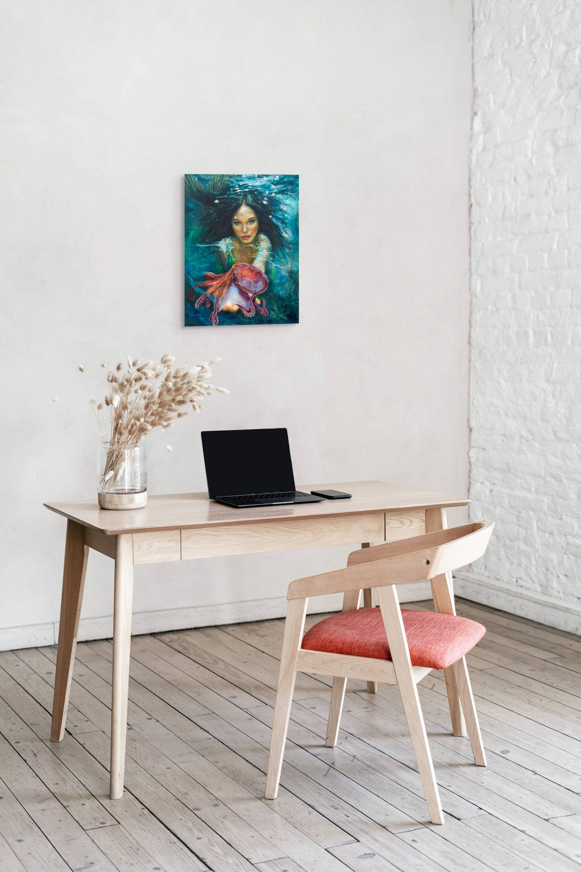 A museum-grade canvas print of "A Glimpse Beyond", featuring a quiet yet powerful ocean moment from the Mysteries of the Deep collection. This evocative piece shows a mermaid extending her hand to a watchful octopus - a gesture of trust, curiosity, and unspoken understanding. Professionally stretched and ready to hang - or frame to suit your space. A portion of proceeds supports ocean conservation.