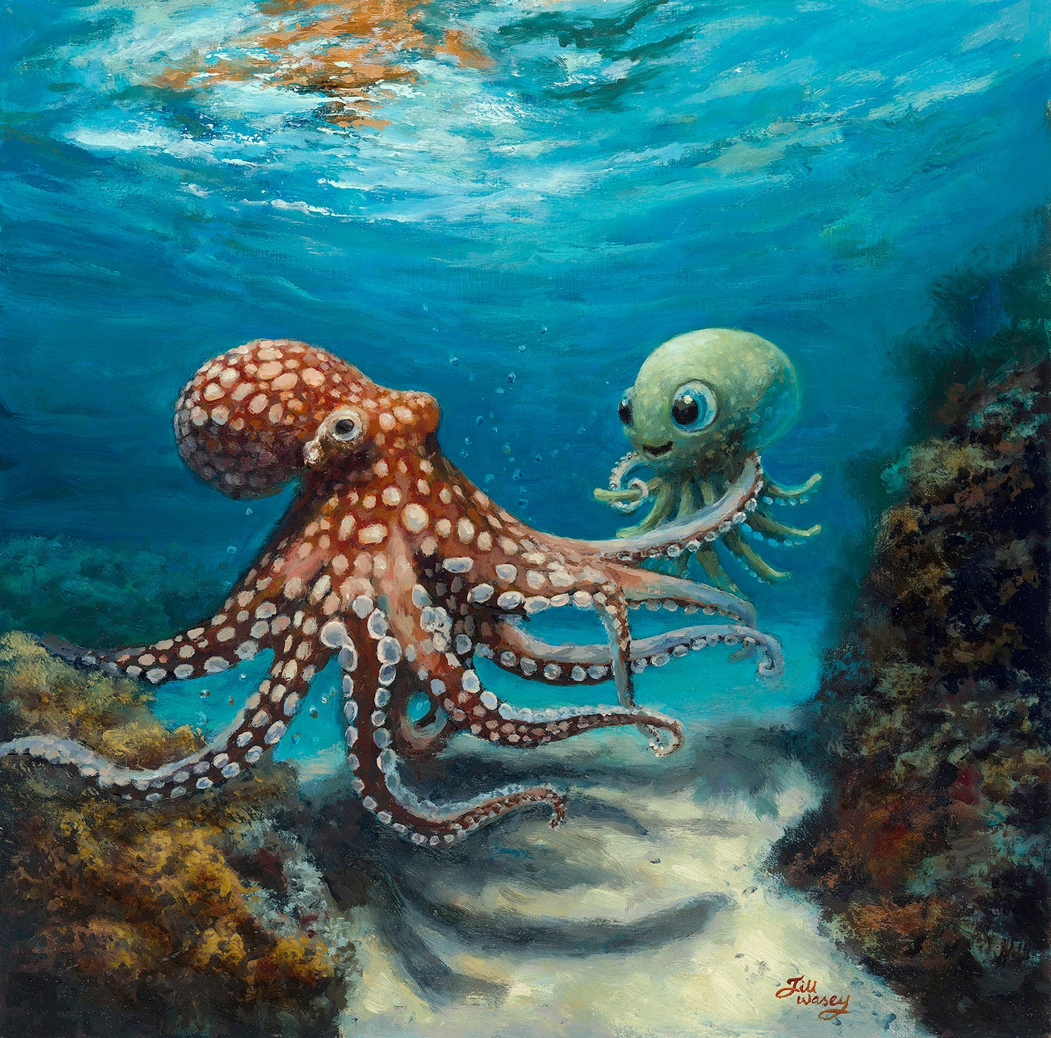 An octopus gently cradles a small plastic toy version of itself, holding it out with careful curiosity. Their eyes meet - one alive, intelligent, aware...the other, frozen in moulded plastic.