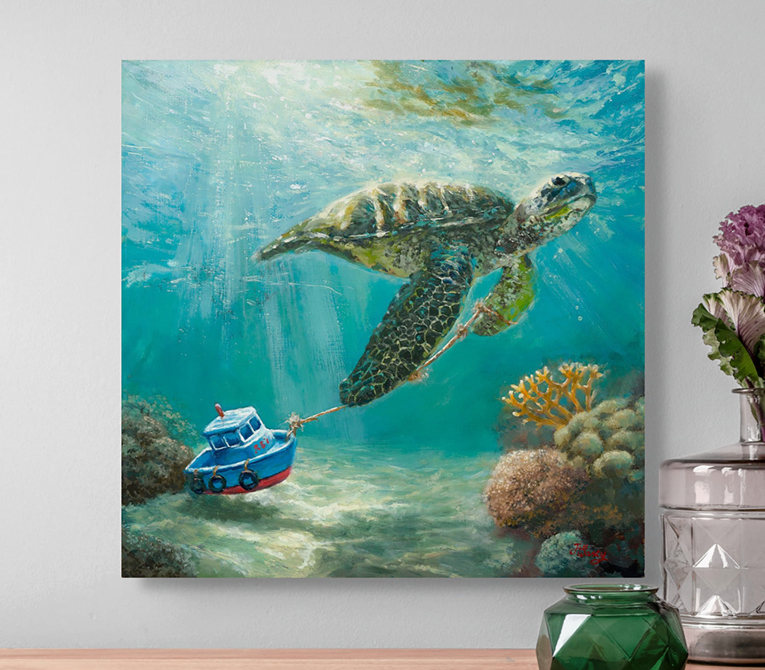 A museum-grade canvas print of "Ocean Hitchhiker", featuring a heartwarming ocean scene from the Curious Encounters collection. Professionally stretched and ready to hang - or frame to suit your space. A portion of proceeds supports ocean conservation.